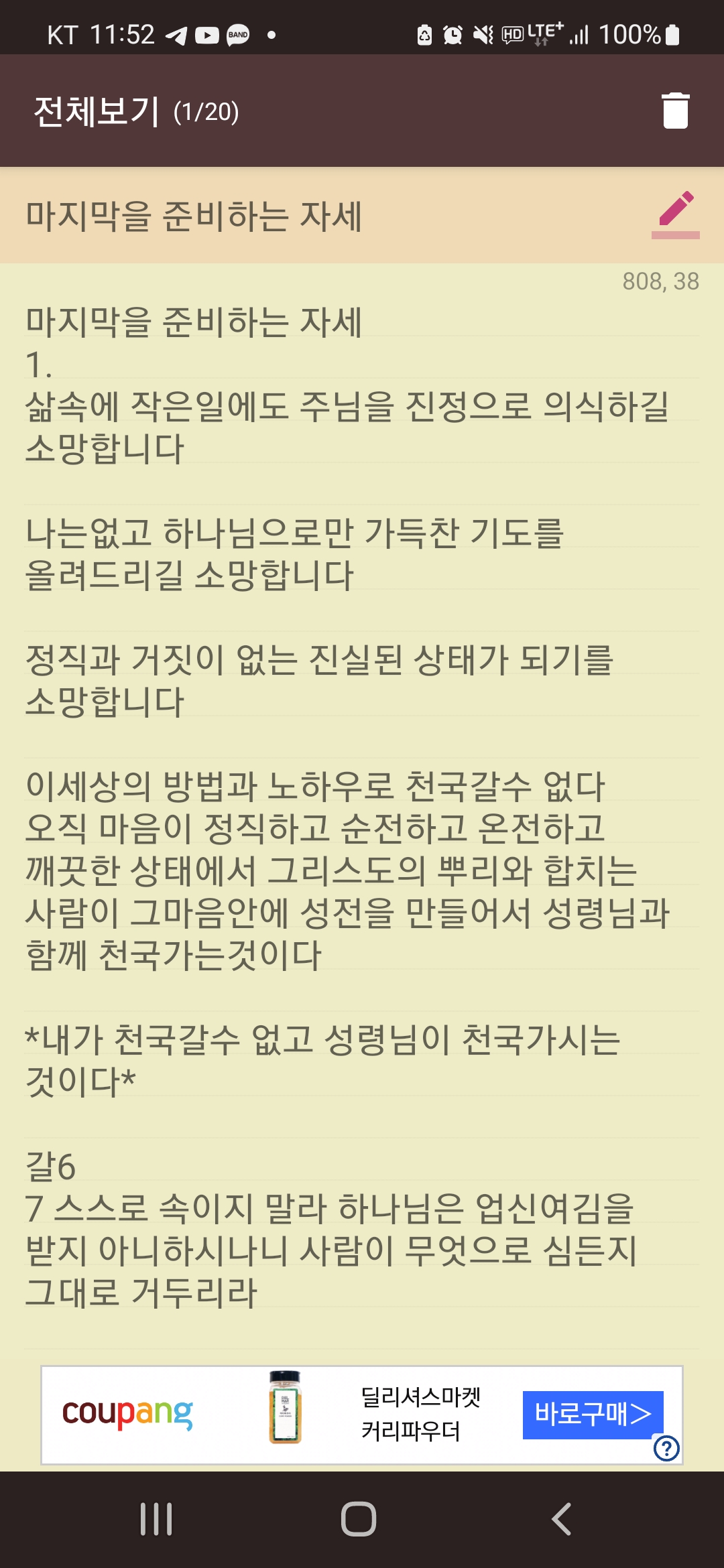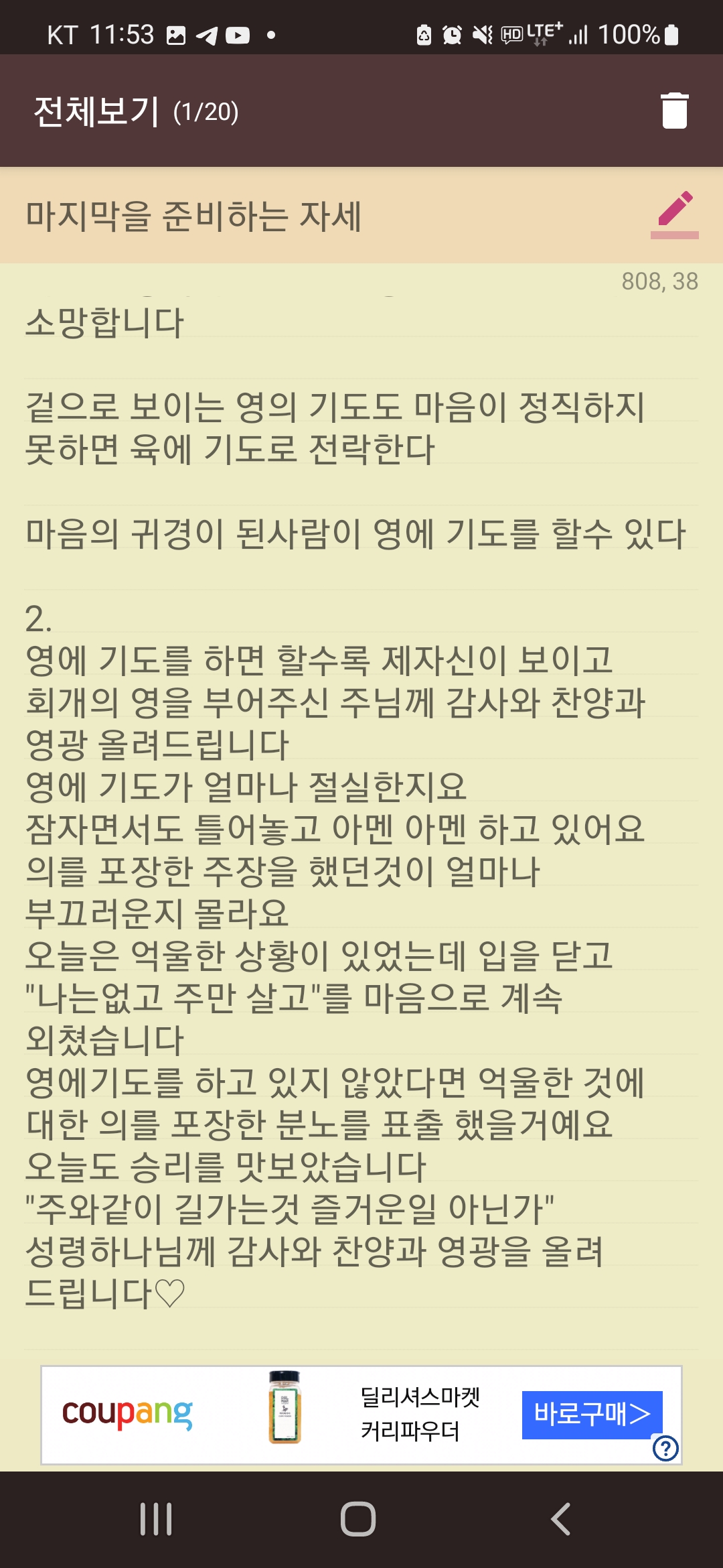 그런데 어느순간 형식적으로 변하는것같아 2~3일 정도 기도를 멈추고 마음으로만 주님께 기도하고 있는 중 오늘